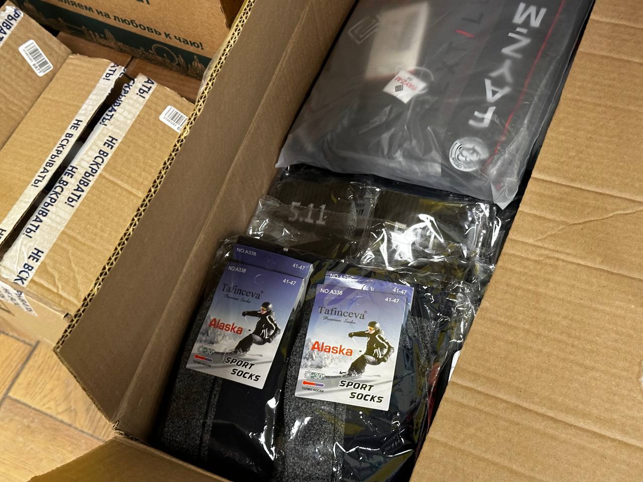 В холодное время года военнослужащим особенно требуются теплые вещи и средства личной гигиены. В состав гуманитарного груза вошли термобелье, флисовые кофты, тактические носки и влажные салфетки.